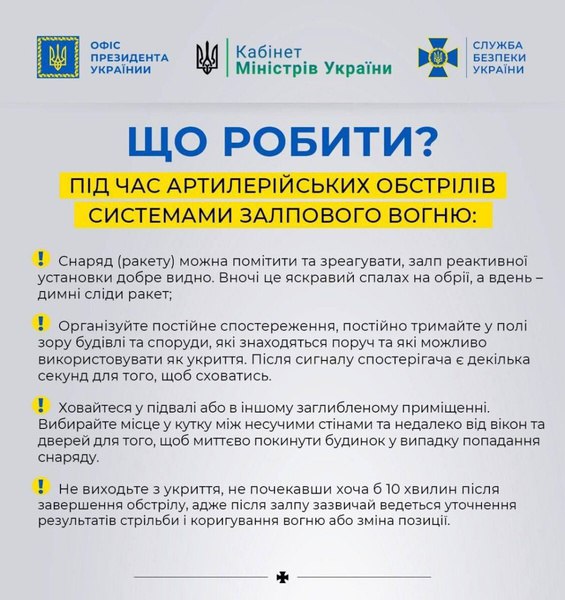 – у разі потрапляння у район обстрілу – сховатись у найближчу захисну споруду цивільної оборони, сховище (укриття). У разі відсутності пристосованих сховищ, для укриття використовувати нерівності рельєфу (канави, окопи, заглиблення від вибухів тощо). У разі раптового обстрілу та відсутності поблизу споруд цивільного захисту, сховища і укриття − ляжте на землю головою в бік, протилежний вибухам. Голову слід прикрити руками (за наявності для прикриття голови використовувати валізу або інші речі). Не виходьте з укриття до кінця обстрілу;